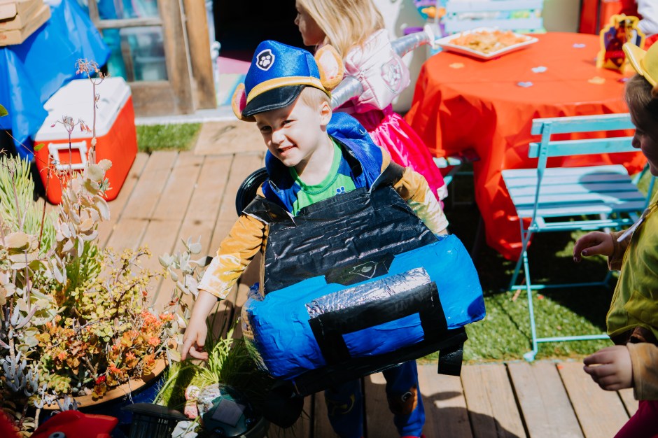 - Paw Patrol Mission. Once the kids had eaten and pinned the tail on the dog, it was time to start our Mission. We basically asked Milo what he wanted to incorporate into the story and naturally, Chickeltta had to be saved for Mayor Goodways sake. It started with me squatting in a cardboard playhouse holding up Mayor Goodway begging the Paw Patrol to save Chickeletta, my pet chicken who had run away and she needed their help. High pitched voice and all. Then Ryder led the Paw Patrol around the yard. They had to get in their vehicles and try to find her. Then Ryder pulled out his location detector device (an X-Box Remote) attached to Chickelleta’s ankle to locate her inside of a mountain! The ‘mountain’ was our shed. We drew rocks on a poster that the kids had to use water balloons to hit and ‘break away’ the rocks. Then after the kids have had a turn, they opened up the shed to reveal chickeletta. BTW, this whole time that they were busy with their vehicles I went over behind the shed and shook it and made Chickelletta distressed noises. When they opened the shed, Ryder informs the crew that it is really a volcano that was going to explode! And I had silly string that I sprayed up and over the shed all over the kids for a finale surprise.